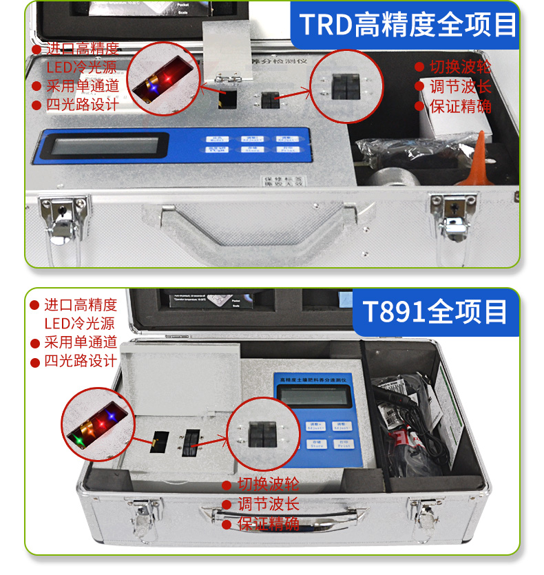 能夠檢測土壤及化肥、有機肥(含葉面肥、水溶肥、噴施肥等)、植株中的速效氮、速效磷、有效鉀、全氮、全磷、全鉀、有機質(zhì)、酸堿度,鈣、鎂、硫、鐵、錳、硼、鋅、銅、氯、硅、鉬等各種中微量元素以及鉛、鉻、鎘、汞、砷、鎳、鋁、氟、鈦、硒等各種重金屬含量。