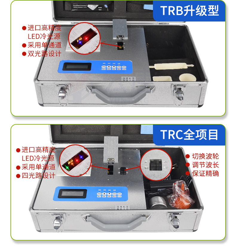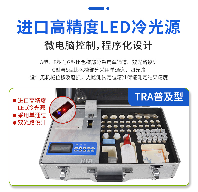 采用高亮LED燈光源、雙撥輪濾光式處理技術(shù),保證光源波長穩(wěn)定,