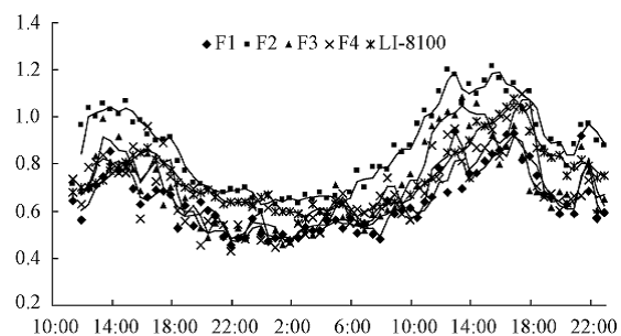 圖b  RR-7330測量系統(tǒng)四個通道測量的土壤呼吸與li-8100測量日變化對比(中國林科院,高峻,2011)