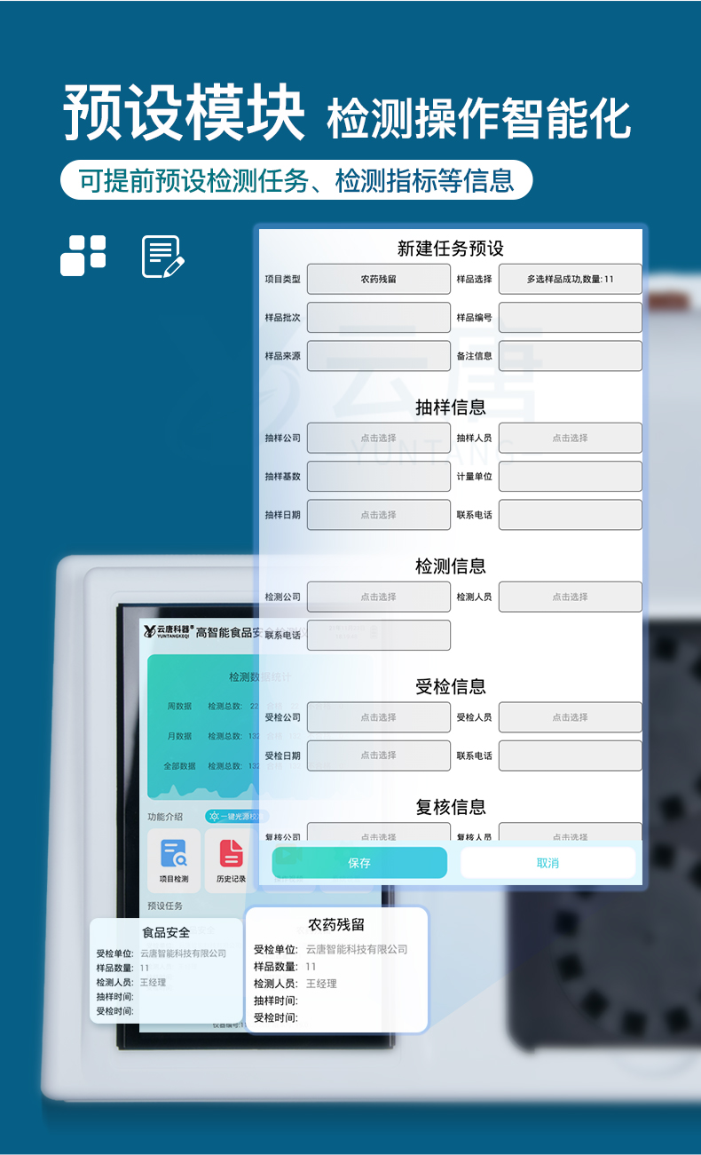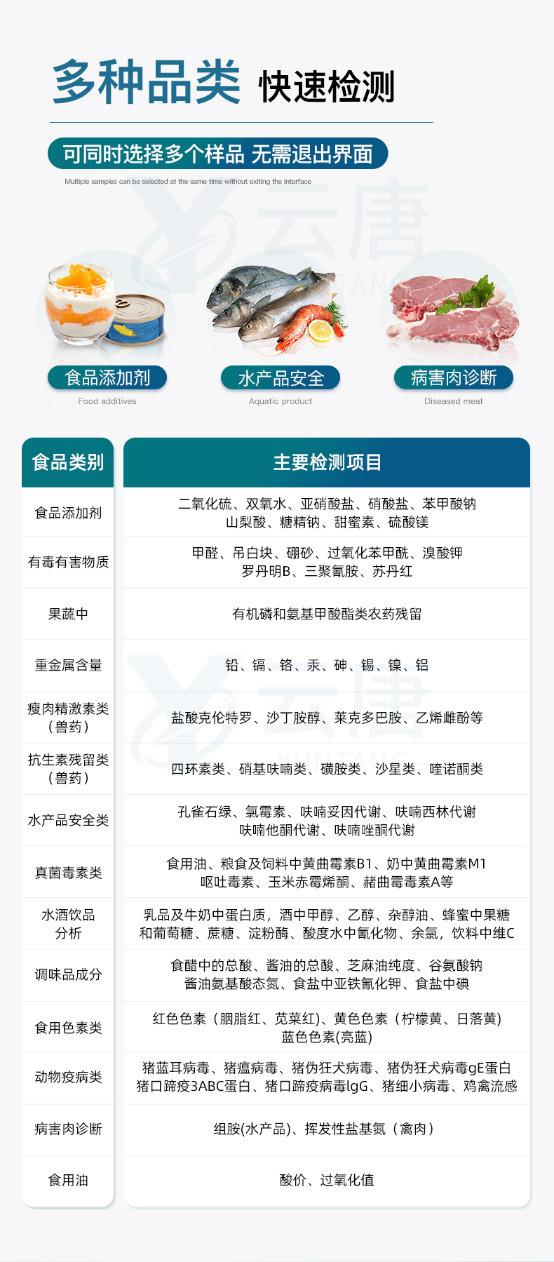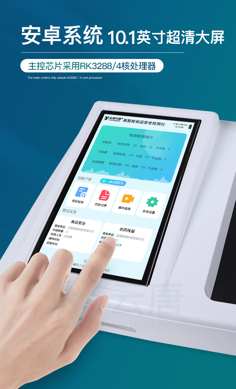 山東云唐智能科技有限公司生產(chǎn)的高智能食品安全檢測儀為集成化食品安全快速檢測分析設(shè)備,采用臺式一體化設(shè)計,可快速檢測200多種食品安全項(xiàng)目,包含非食用化學(xué)物質(zhì)、濫用食品添加劑、農(nóng)藥殘留、獸藥殘留、重金屬、病害肉、營養(yǎng)強(qiáng)化劑、抗生素類殘留、激素類殘留、真菌毒素類殘留、化學(xué)類殘留等項(xiàng)目的定性定量檢測。