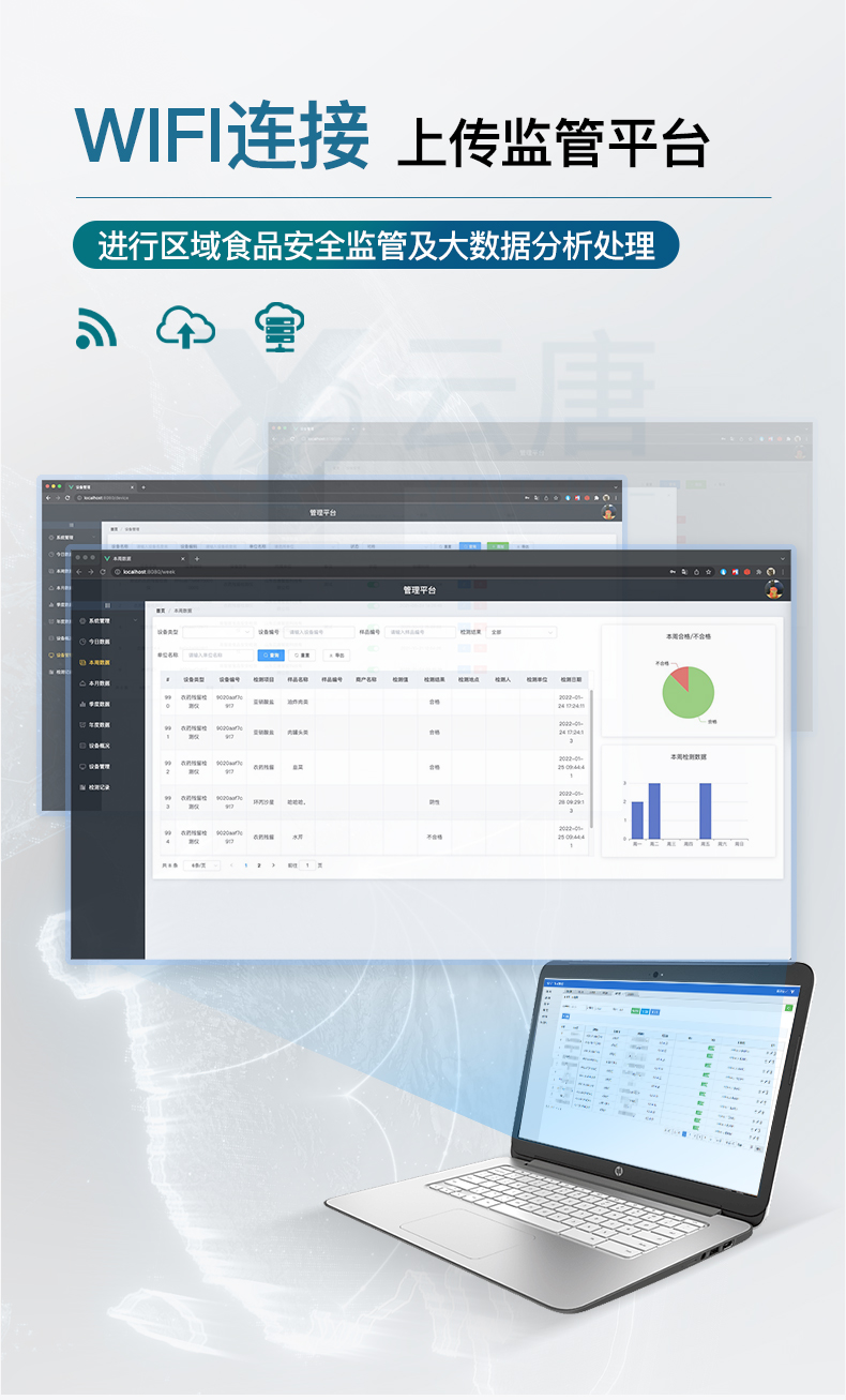 ★數(shù)據(jù)監(jiān)管系統(tǒng):同步對接監(jiān)管平臺,數(shù)據(jù)可局域網(wǎng)和互聯(lián)網(wǎng)數(shù)據(jù)上傳,檢測結(jié)果可選擇直接傳至食品安全監(jiān)管平臺。進(jìn)行區(qū)域食品安全監(jiān)管及大數(shù)據(jù)分析處理與數(shù)據(jù)統(tǒng)計,檢測區(qū)域食品安全長短期動態(tài),達(dá)到食品安全問題預(yù)估、預(yù)警。(需提供對應(yīng)食品理化分析系統(tǒng)計算機(jī)軟件著作權(quán))。