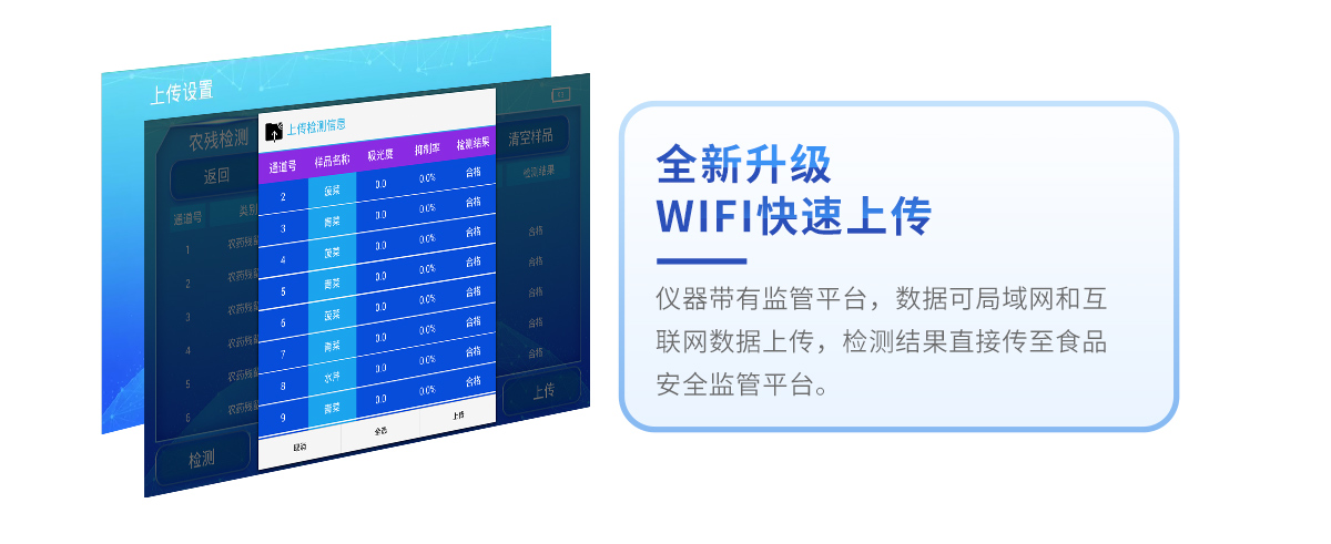 3、儀器帶有監(jiān)管平臺(tái),數(shù)據(jù)可局域網(wǎng)和互聯(lián)網(wǎng)數(shù)據(jù)上傳,檢測(cè)結(jié)果直接傳至食品安全監(jiān)管平臺(tái)。進(jìn)行區(qū)域食品安全監(jiān)管及大數(shù)據(jù)分析處理與數(shù)據(jù)統(tǒng)計(jì),檢測(cè)區(qū)域食品安全長短期動(dòng)態(tài),達(dá)到食品安全問題預(yù)估、預(yù)警 。