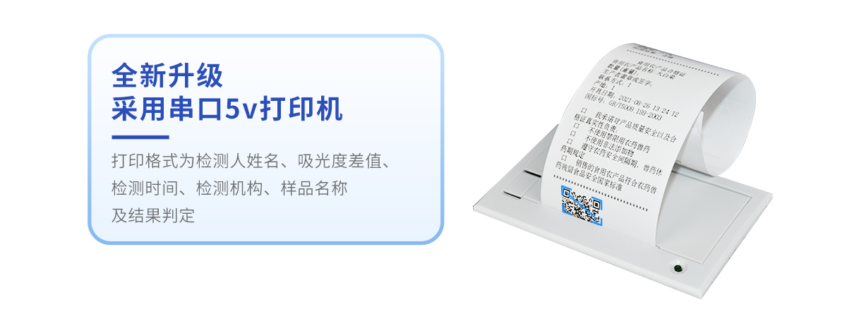 ?、俨捎么?v打印機(jī),可選擇手動(dòng)打印或者自動(dòng)打印,三分鐘出打印結(jié)果,打印格式為檢測(cè)人姓名、吸光度差值、檢測(cè)時(shí)間、檢測(cè)機(jī)構(gòu)、樣品名稱及結(jié)果判定。